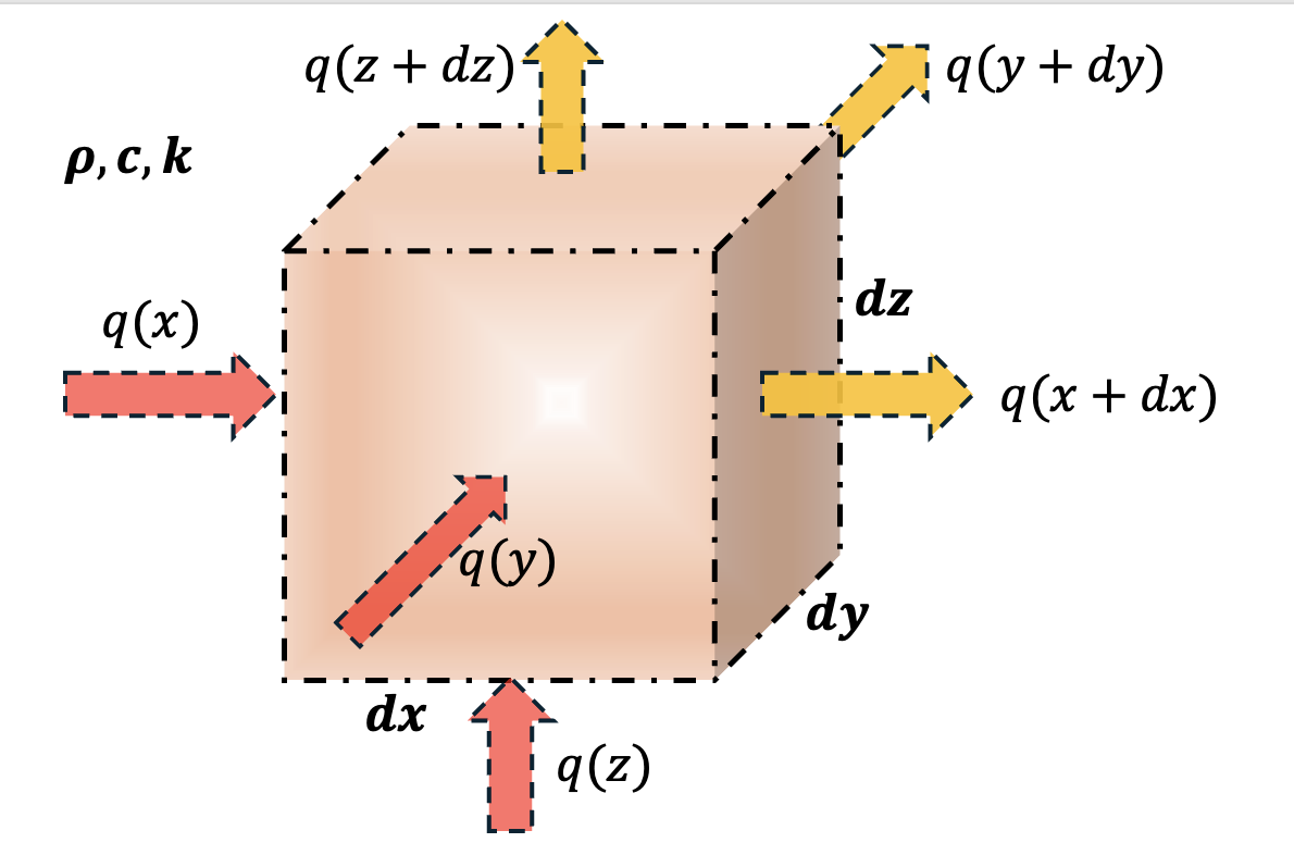 \rho c \frac{\Delta T}{\Delta t} = -\frac{q(x+dx) - q(x)}{dx} - \frac{q(y+dy) - q(y)}{dy} - \frac{q(z+dz) - q(z)}{dz} + \dot{q}_v --- (2)$$ 现在,$q(x+dx)$可以使用泰勒展开式近似如下 $$q(x+dx) ≈ q(x) + \frac{\partial q(x)}{\partial x} dx$$∴ q(x+dx) - q(x) ≈ \frac{\partial q(x)}{\partial x} dxq(x+dx) - q(x) ≈ \frac{\partial q(x)}{\partial x} dx = k \frac{\partial^2 T}{\partial x^2} dx$$ 由上式可知(2)可如式变形